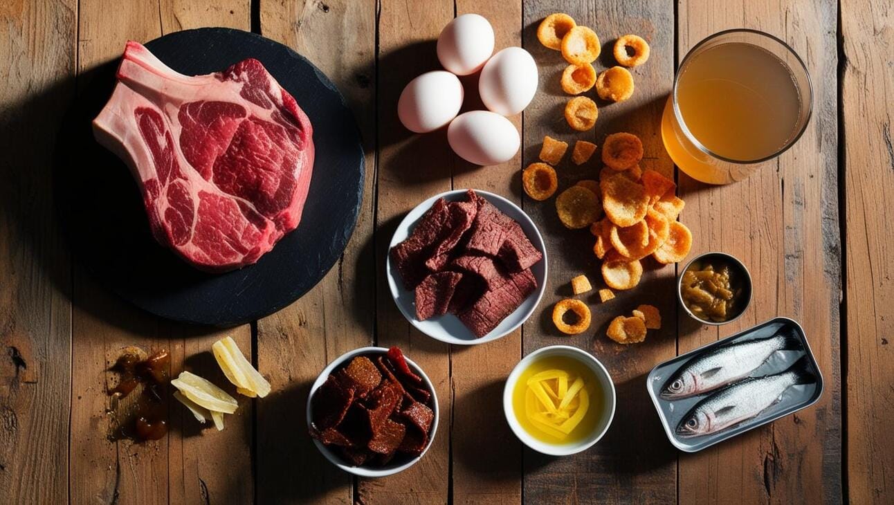 Hard-Boiled Eggs Pork Rinds (No Seed Oils) Beef Jerky (Zero Sugar) Liver Crisps Sardines Canned Oysters or Mussels | Ribeye Steak Pork Belly Duck Legs Ground Beef 80/20 Suet Cubes Smoked Salmon Egg Yolks | Rendered Tallow or Duck Fat Whipped Beef Fat Butter Bone Broth with Added Tallow Pâté Raw or Aged Hard Cheeses (If Tolerated) |